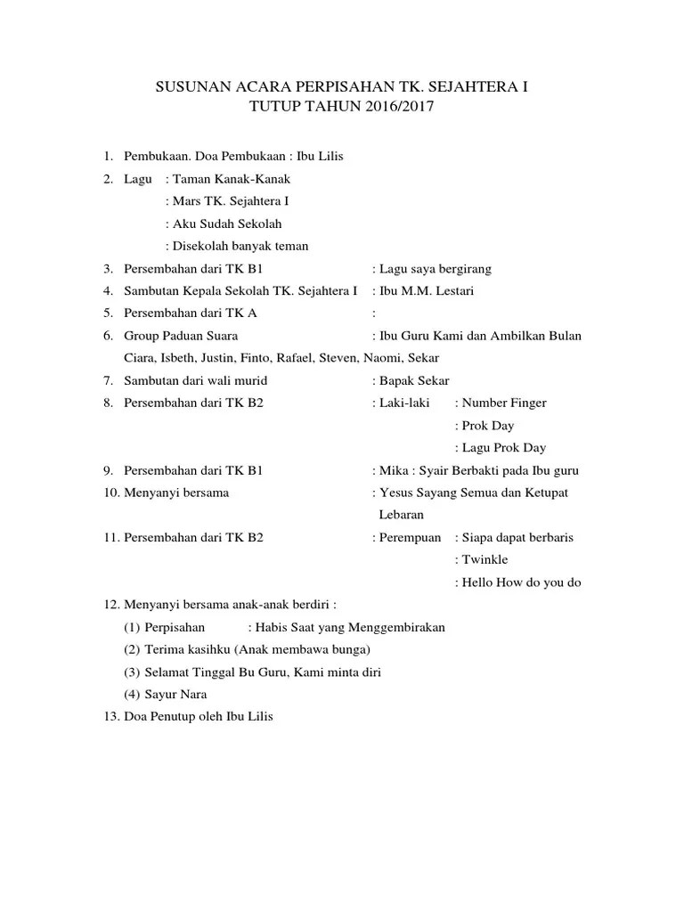 Lagu saya bergirang · 4. 25/03/2021 ÿú contoh susunan acara perpisahan paud dan tk. Susunan acara perpisahan tk yang menarik, contoh susunan acara parenting tk,. Susunan acara pelepasan dan pentas seni siswa siswi angkatan ke vii tk al huda. Perayaan kegembiraan ini salah satunya juga dilaksanakan oleh tk islam terpadu nurul fikri, salah satu sekolah unggulan di depok dengan .